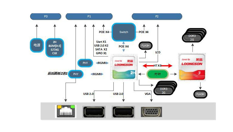 ● 采用1個龍芯3A處理器,最高工作頻率1GHz和一個龍芯2H SOC作為3A橋片,工作頻率800MHz ;3A可以選用,2H工作在SOC模式時,3A可以不用。